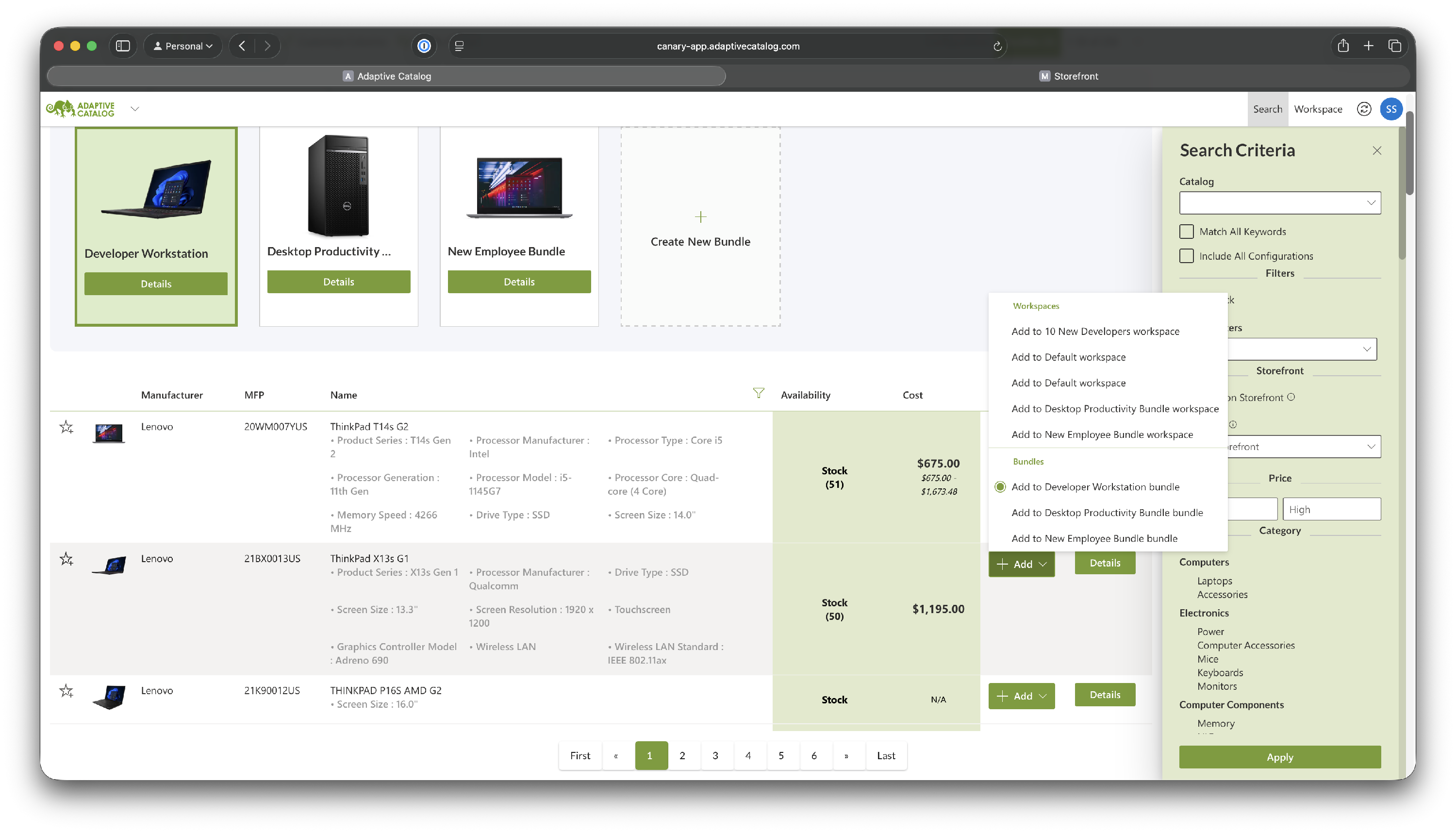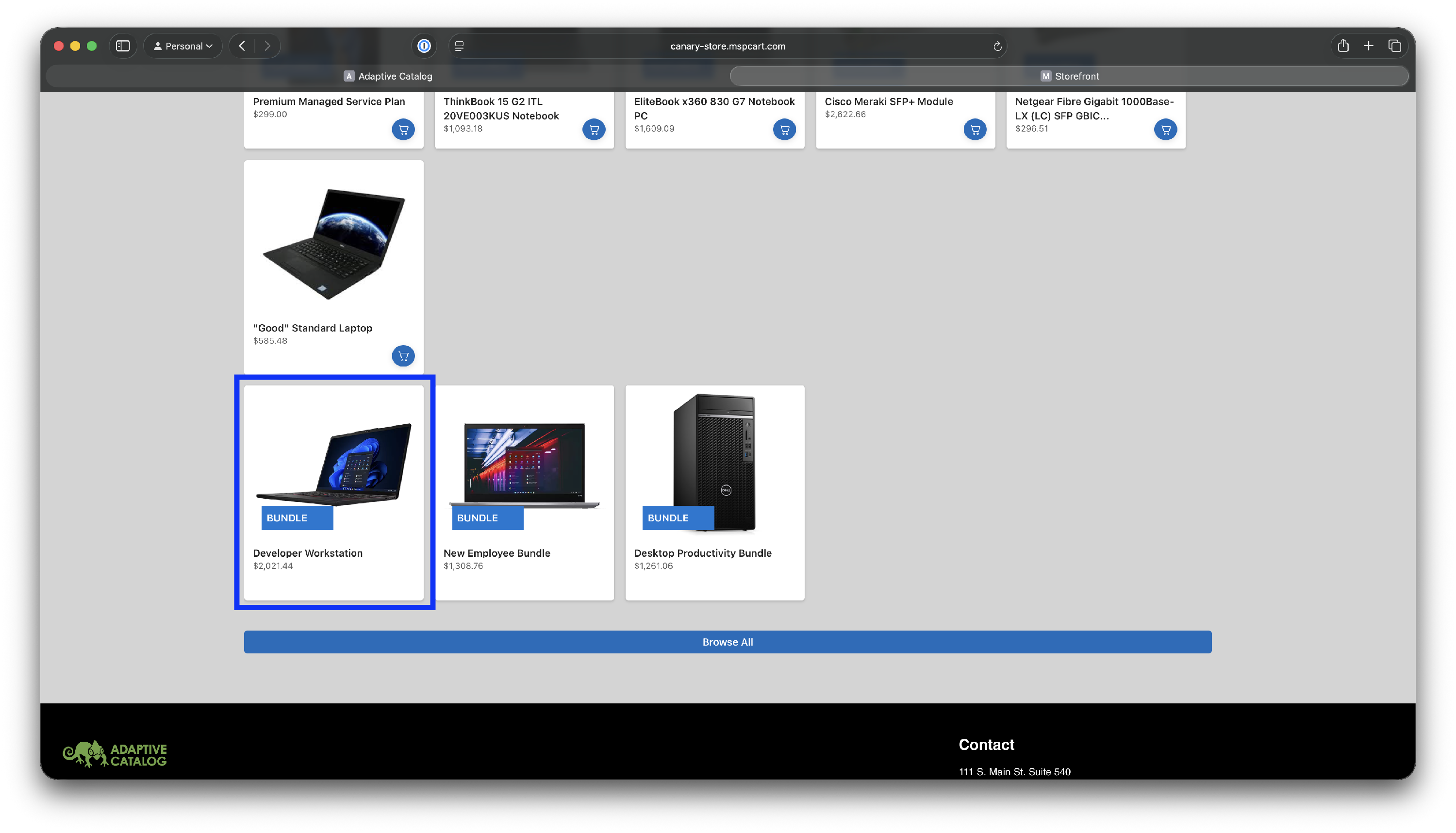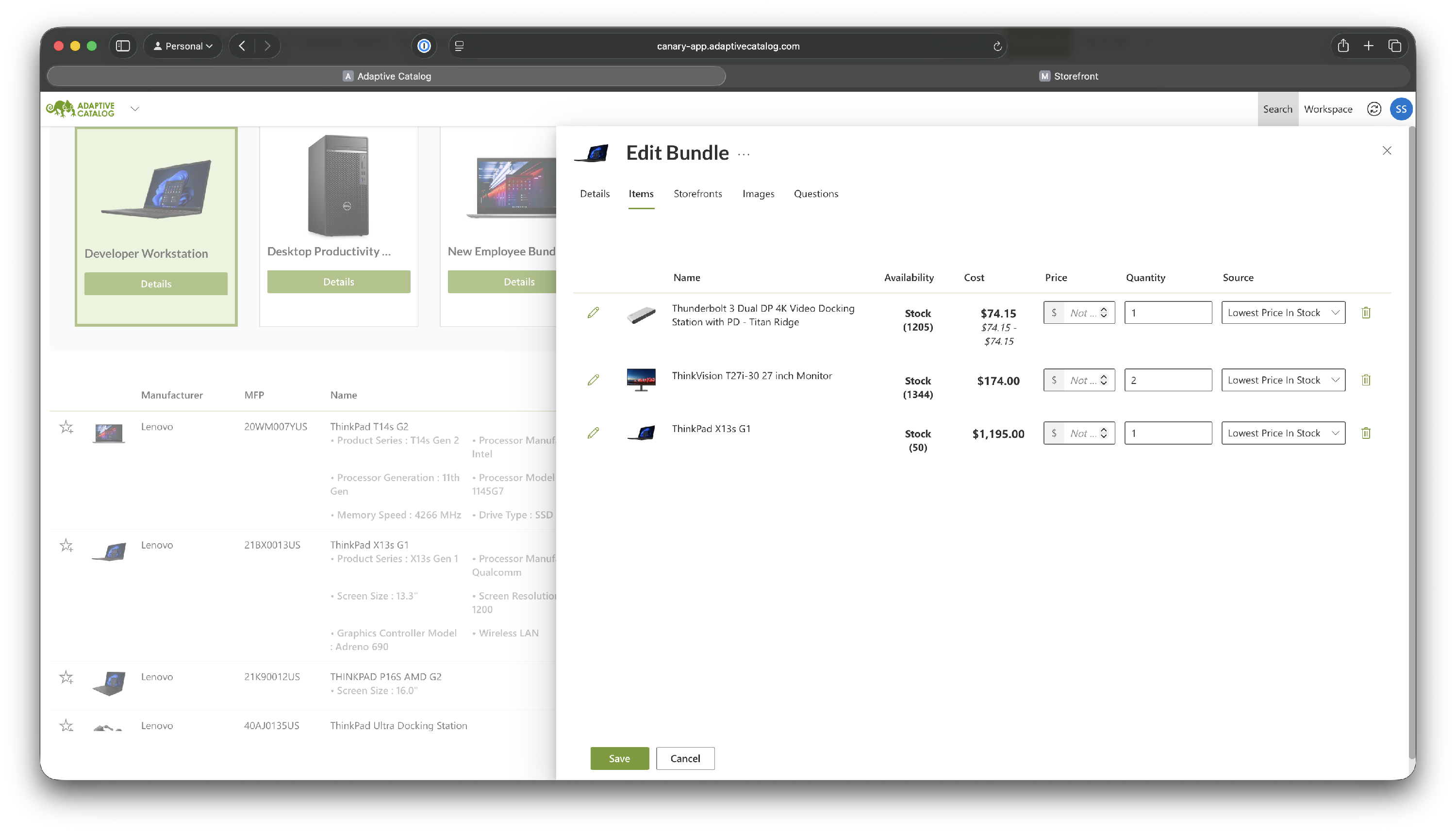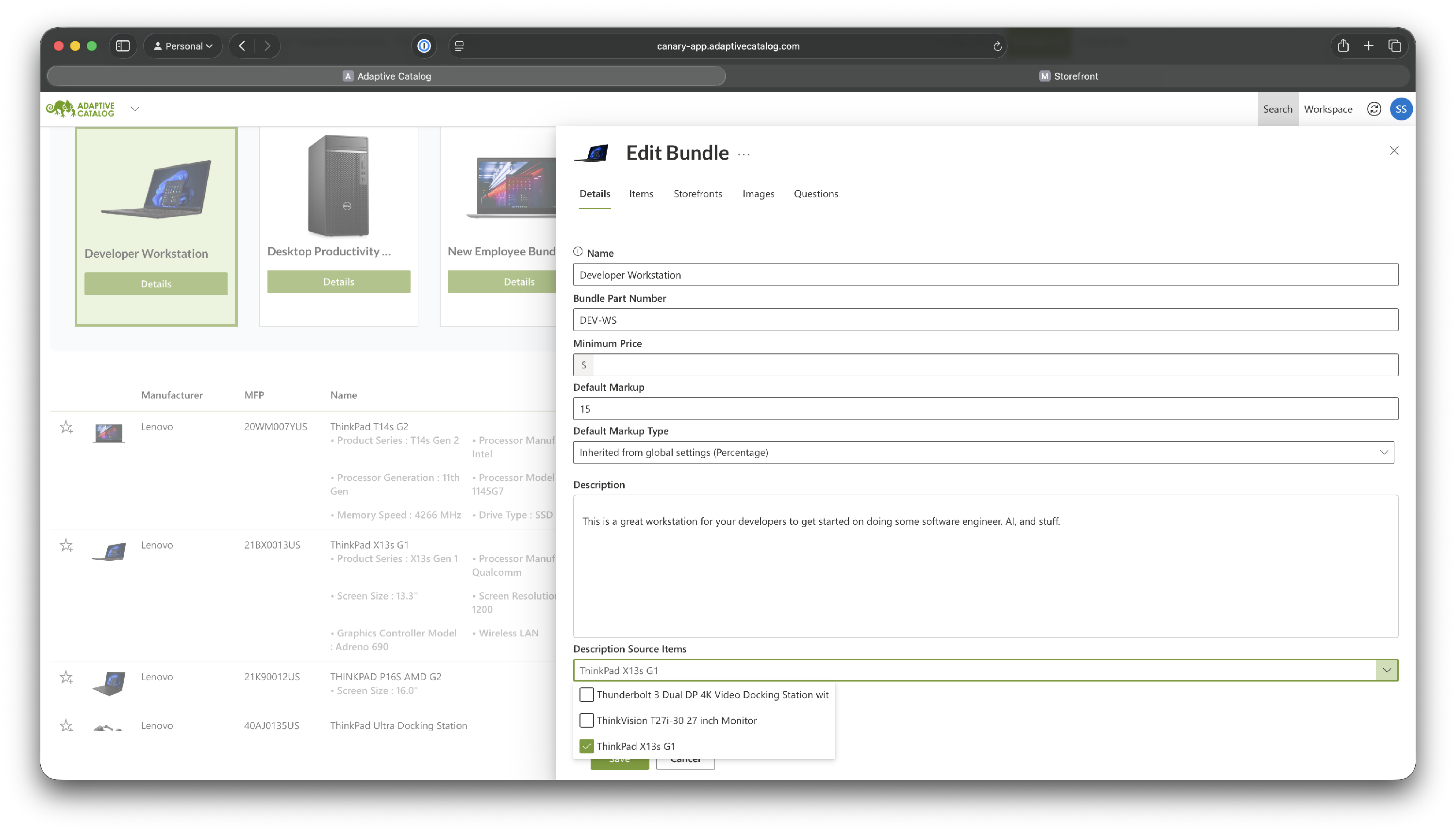 Storefront bundles allow you to package together multiple items into one purchasable item on your storefront. Bundles can include items from any of your distributors, as well as custom items from your PSA or manually created in Adaptive Catalog. An example might be a "New Developer Workstation", which includes your standard professional laptop, a docking station, two monitors, and your managed services plan. Let's walk through building that inside of Adaptive Catalog and listing it on our Storefront.