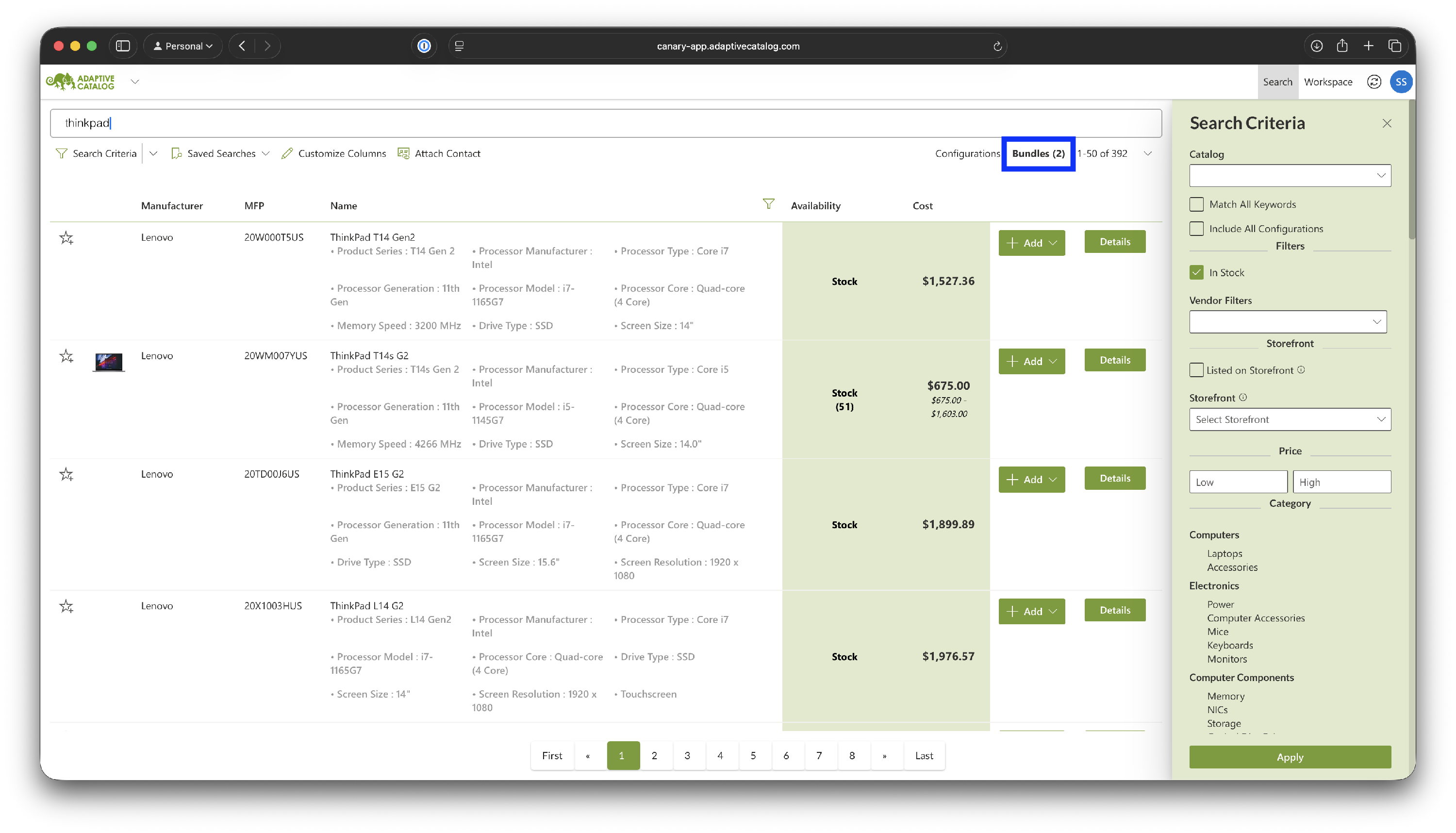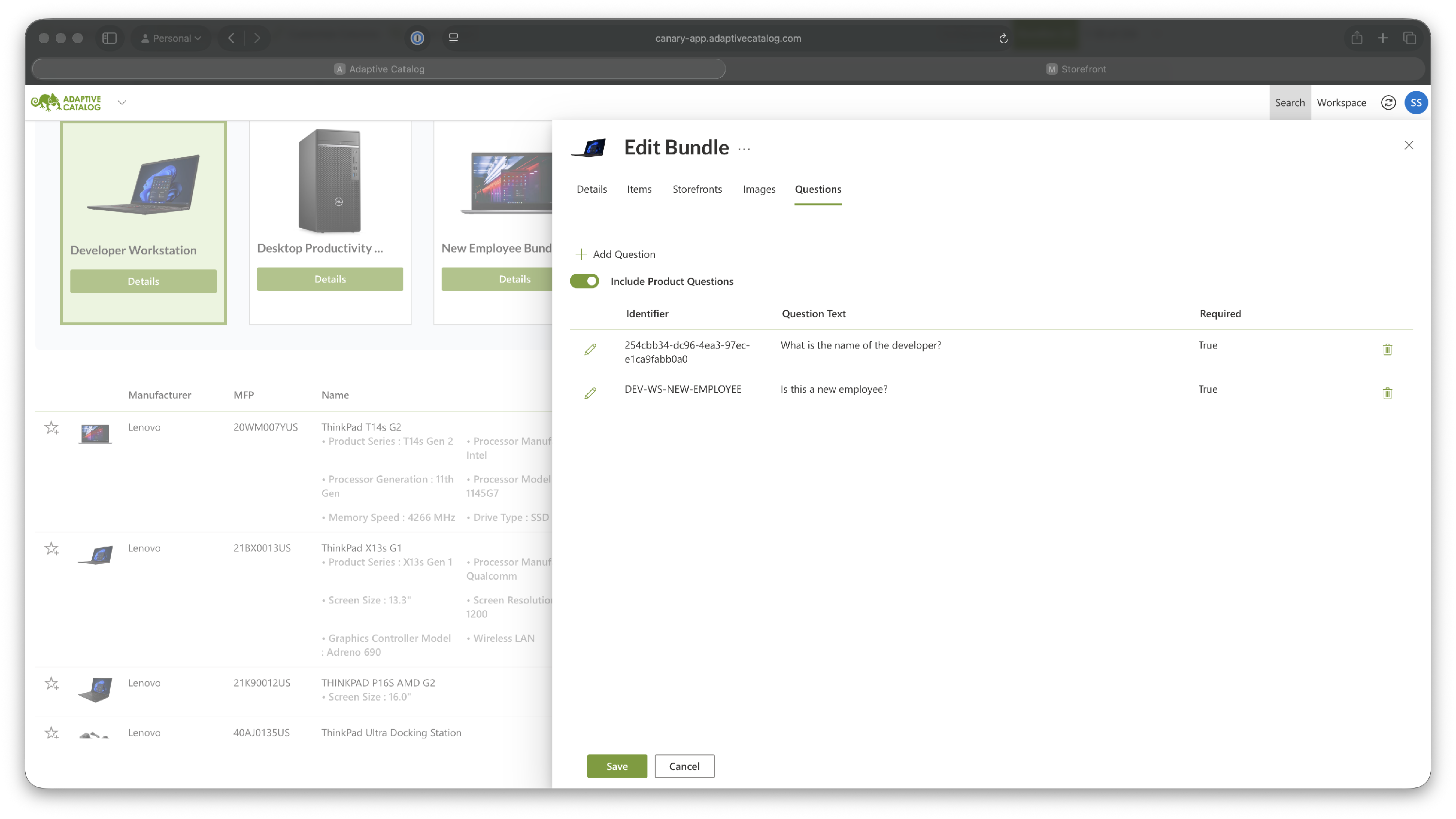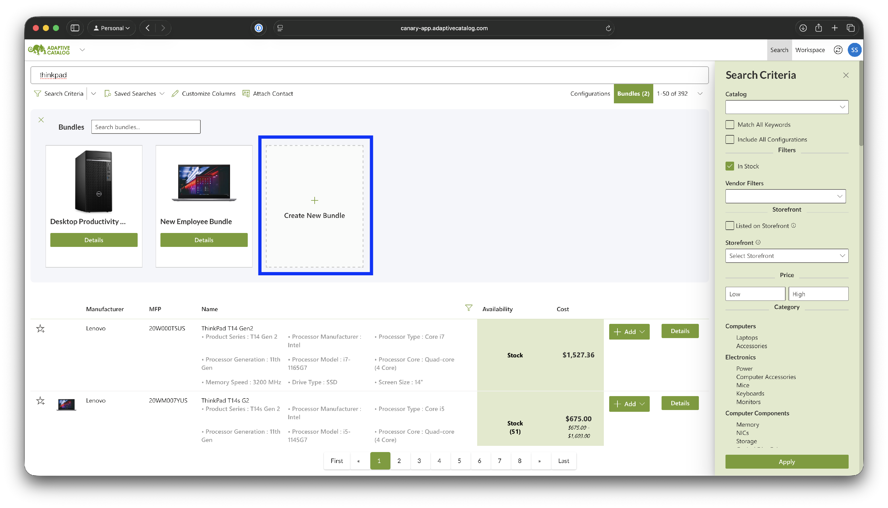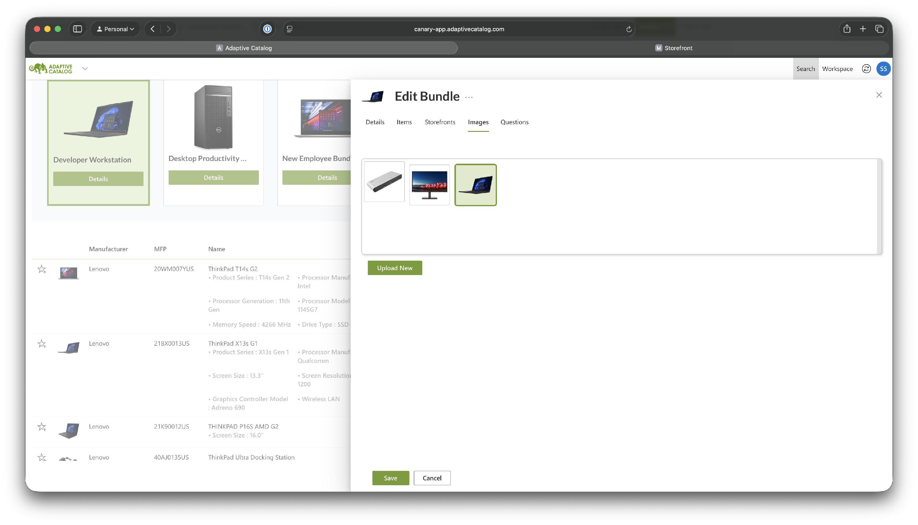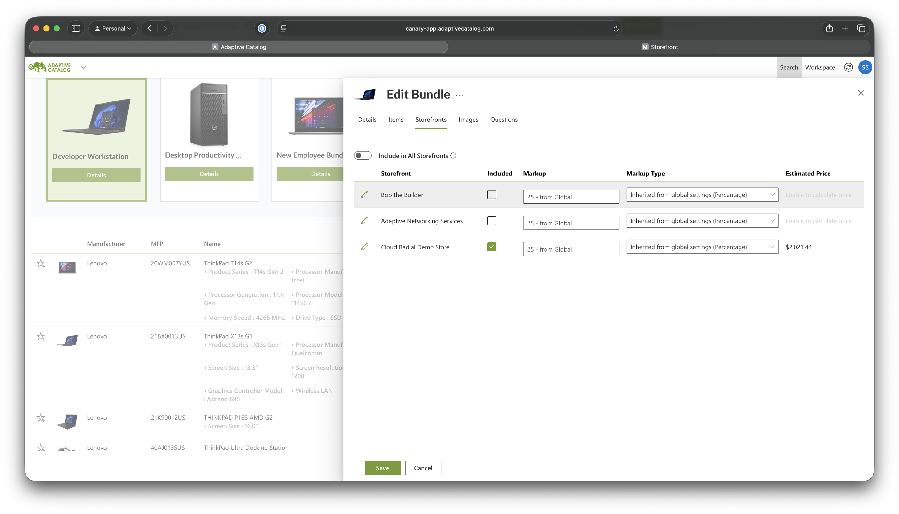 Storefront bundles allow you to package together multiple items into one purchasable item on your storefront. Bundles can include items from any of your distributors, as well as custom items from your PSA or manually created in Adaptive Catalog. An example might be a "New Developer Workstation", which includes your standard professional laptop, a docking station, two monitors, and your managed services plan. Let's walk through building that inside of Adaptive Catalog and listing it on our Storefront.